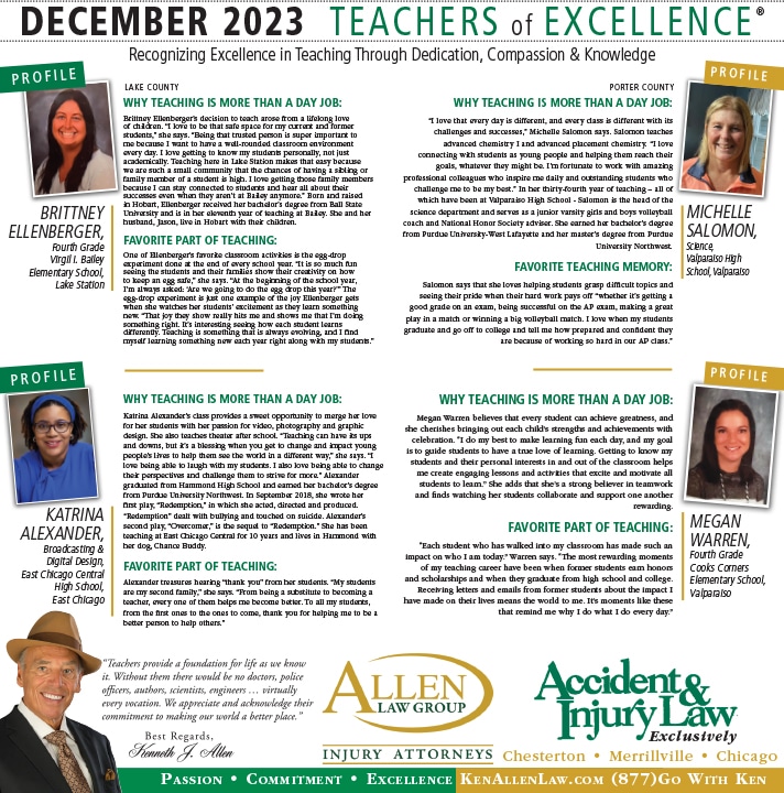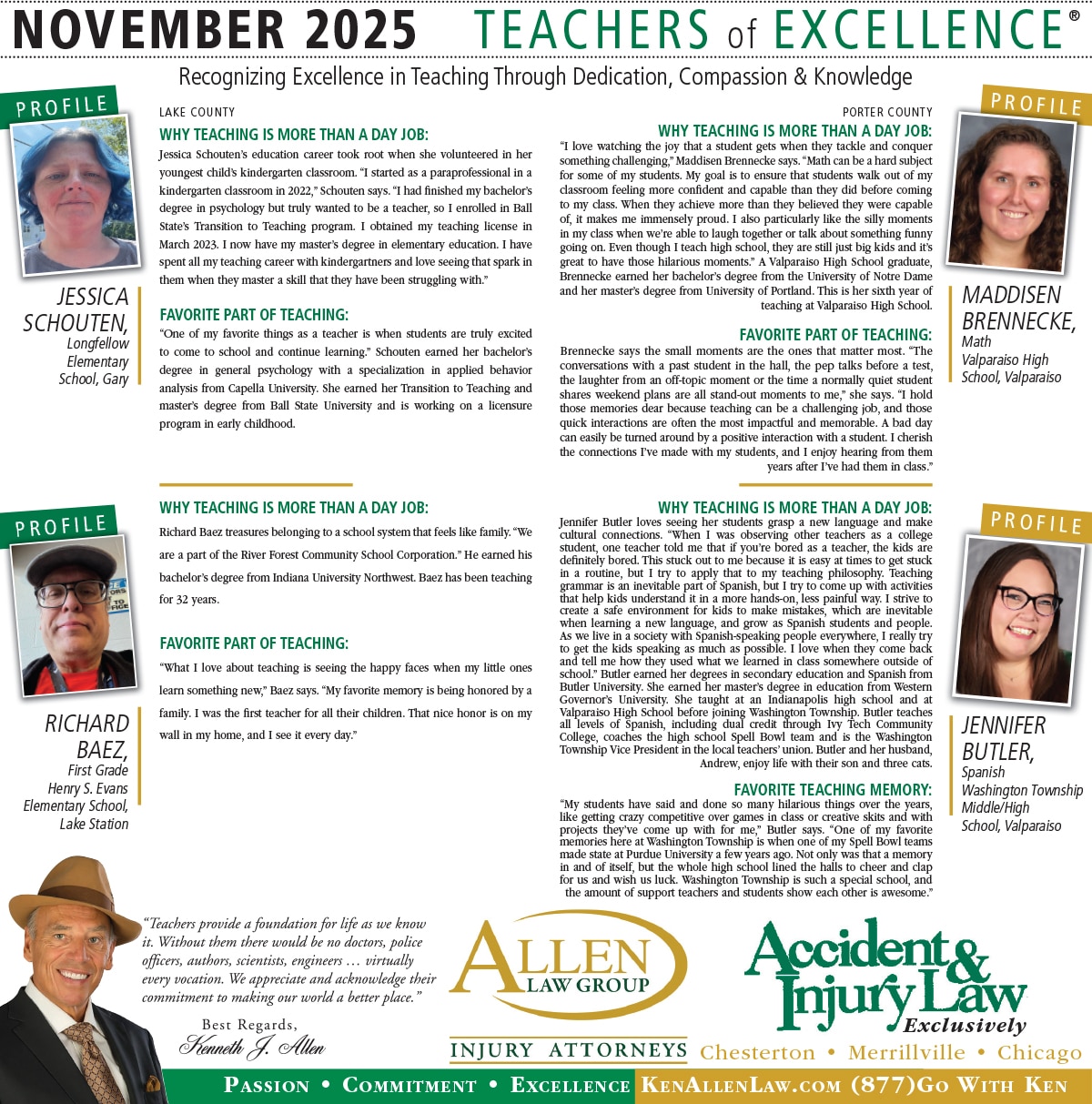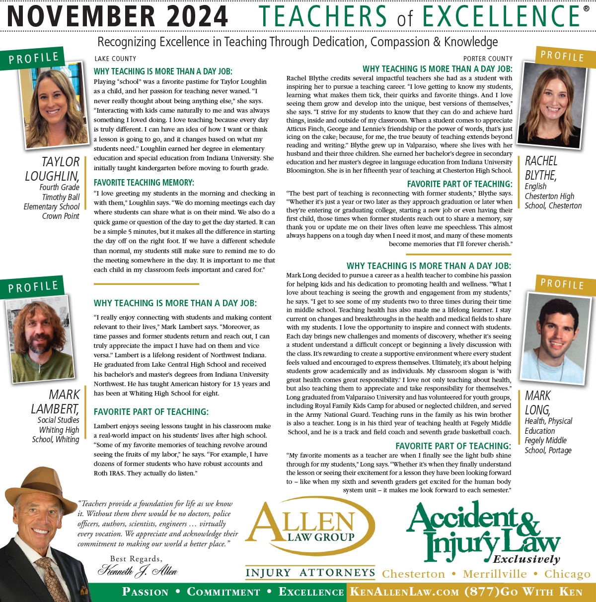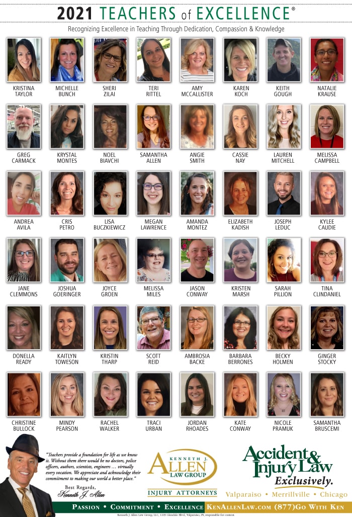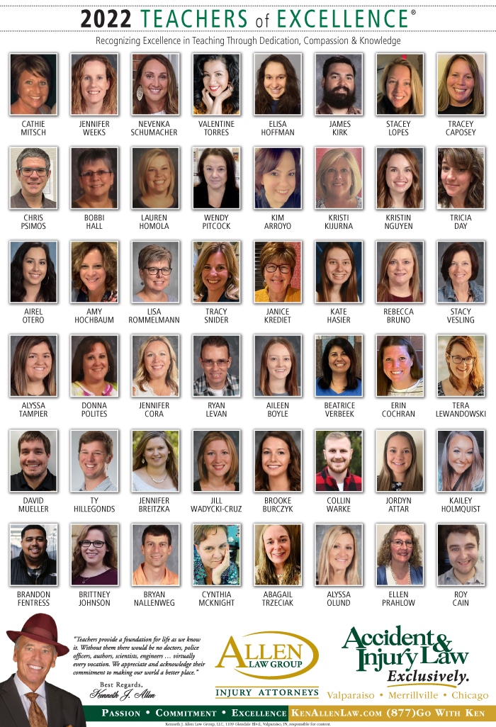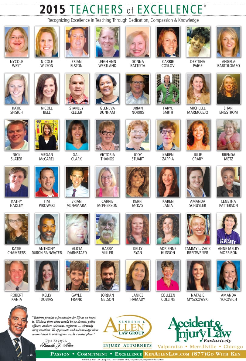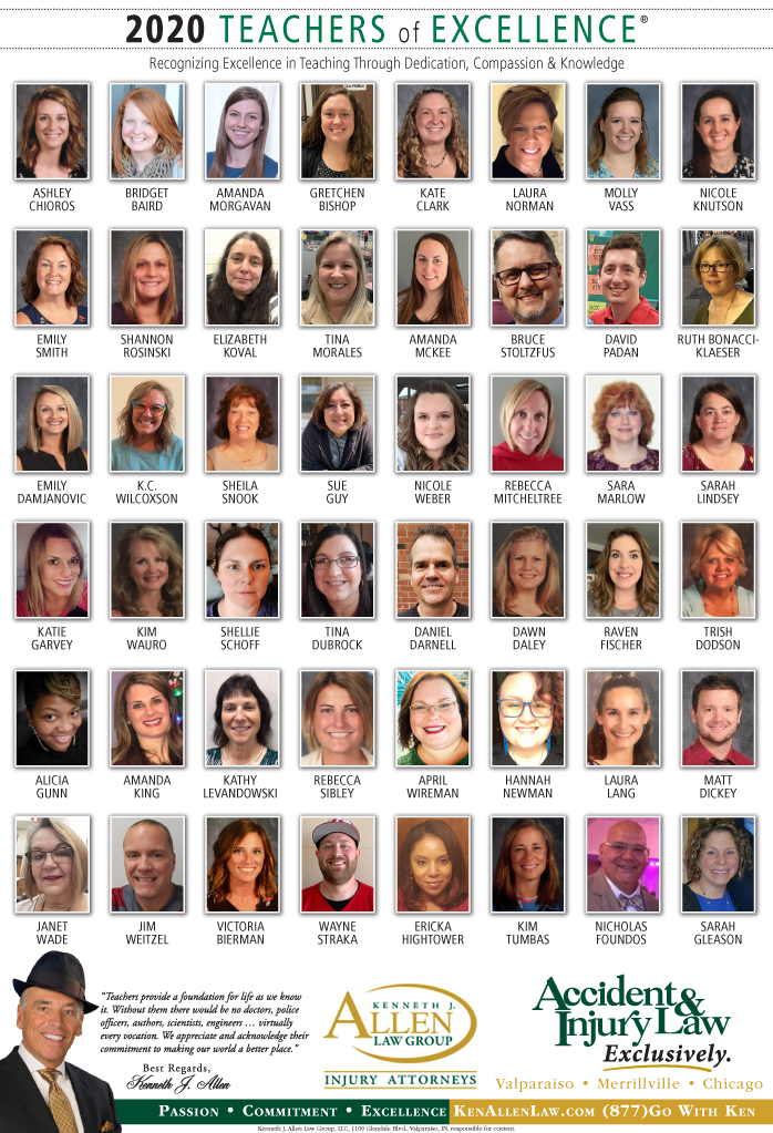 Allen Law Group is proud to support Northwest Indiana teachers who go above and beyond for their students. Allen Law Group recognizes Teachers of Excellence for his or her outstanding contributions to education. “Teachers provide a foundation for life as we know it. Without them, there would be no doctors, police officers, authors, scientists, engineers, virtually every vocation. We appreciate and acknowledge their commitment to making our world a better place,” said Mr. Kenneth J. Allen. Each teacher is recognized by the firm and receives a gift for their fine efforts. To learn more about the educators who are Teachers of Excellence, please read below. If you know of someone who should be recognized as a Teacher of Excellence, please nominate him or her on the page below. Allen Law Group is proud to support the area’s Teachers of Excellence.