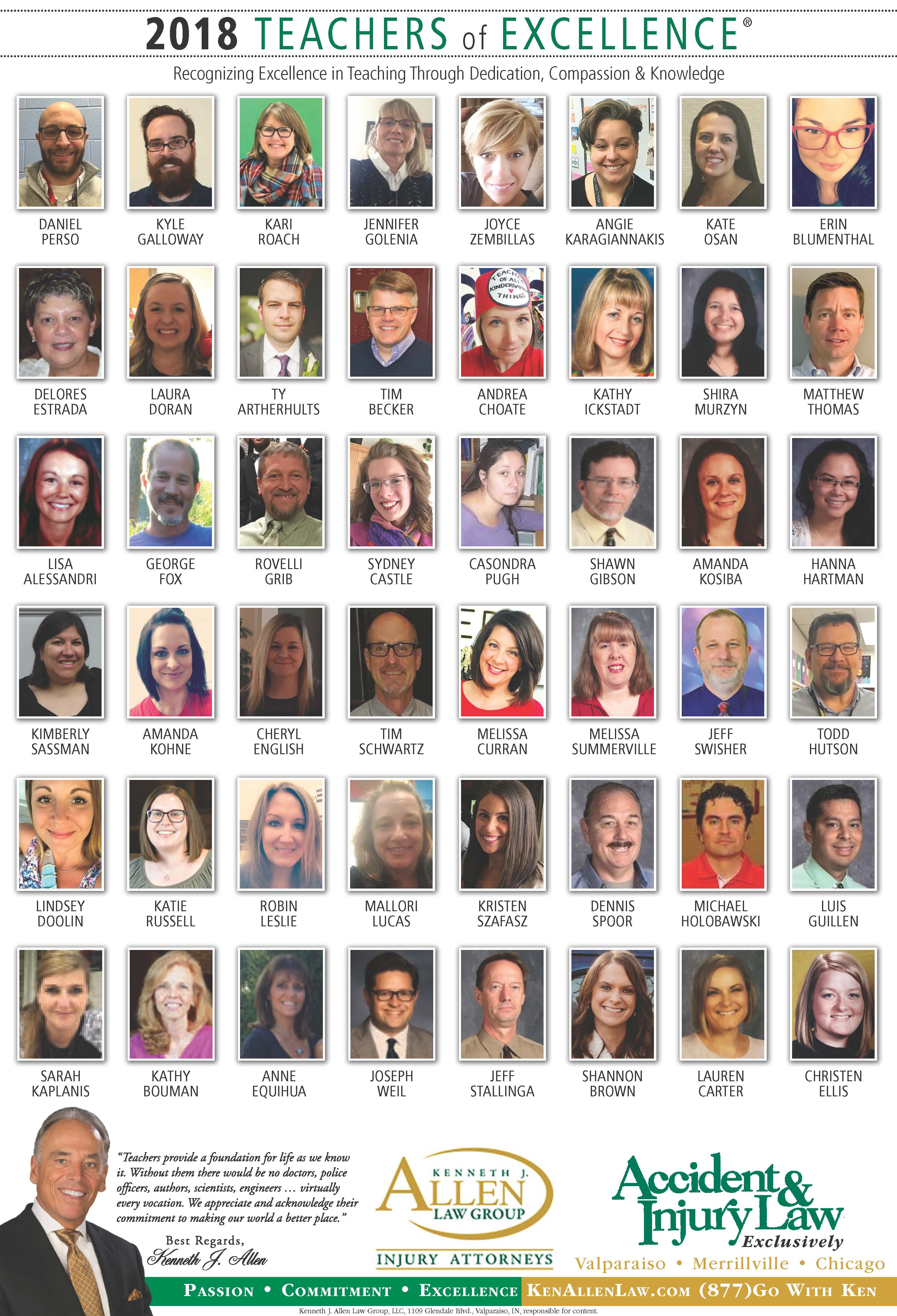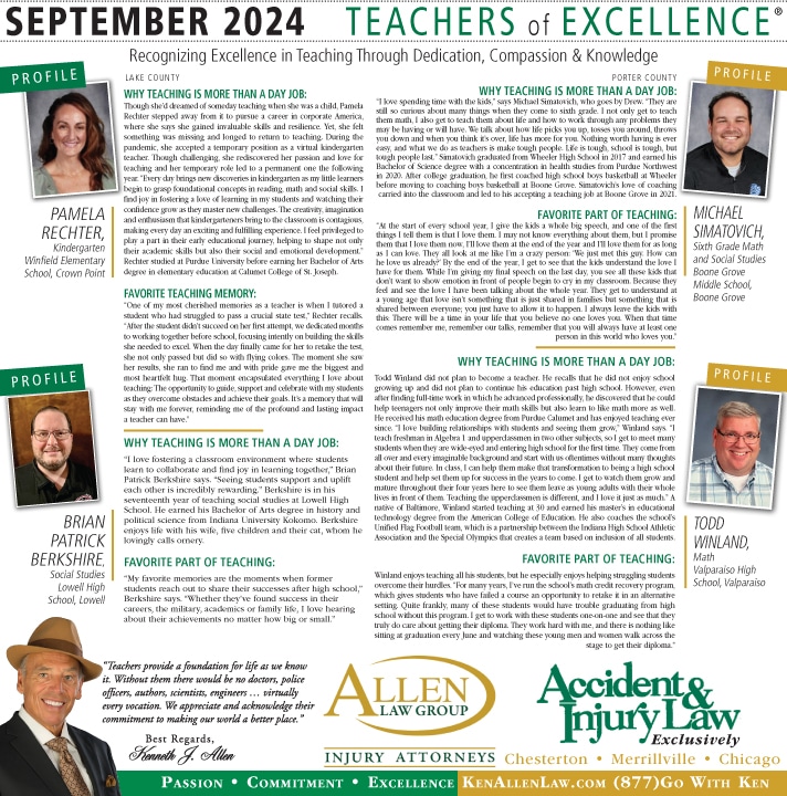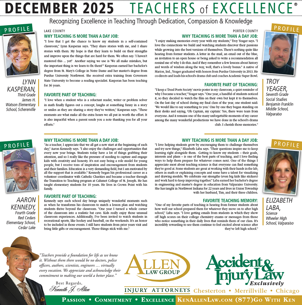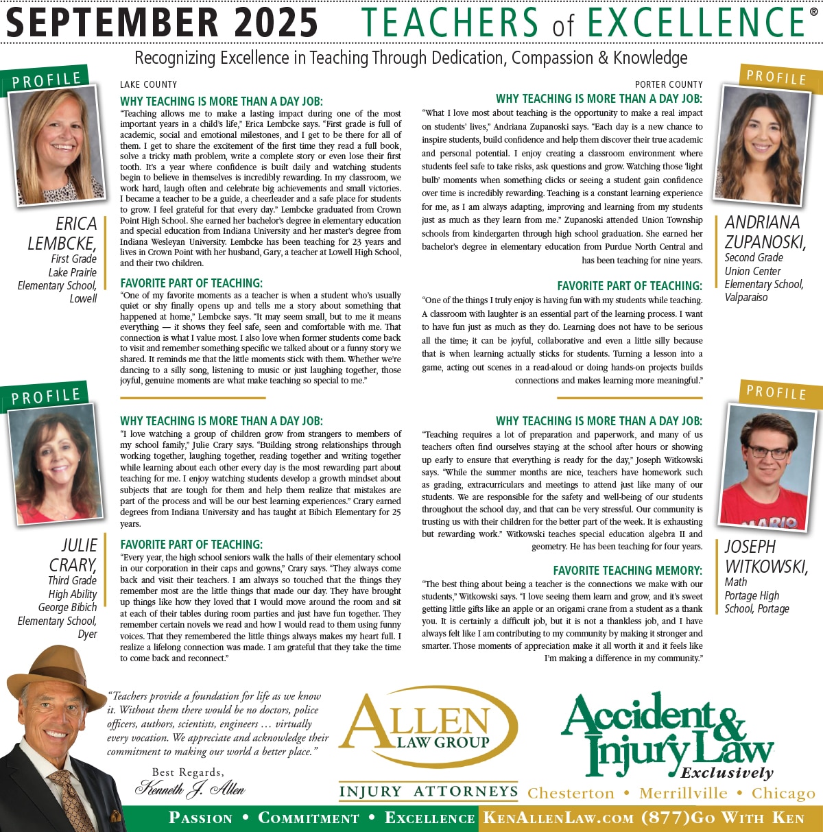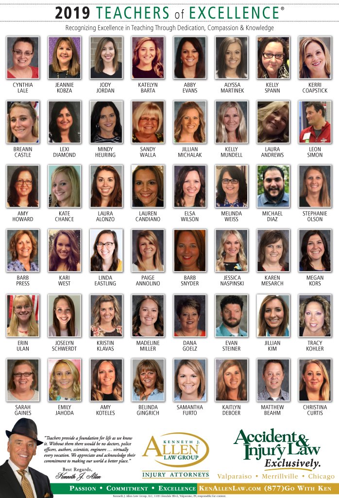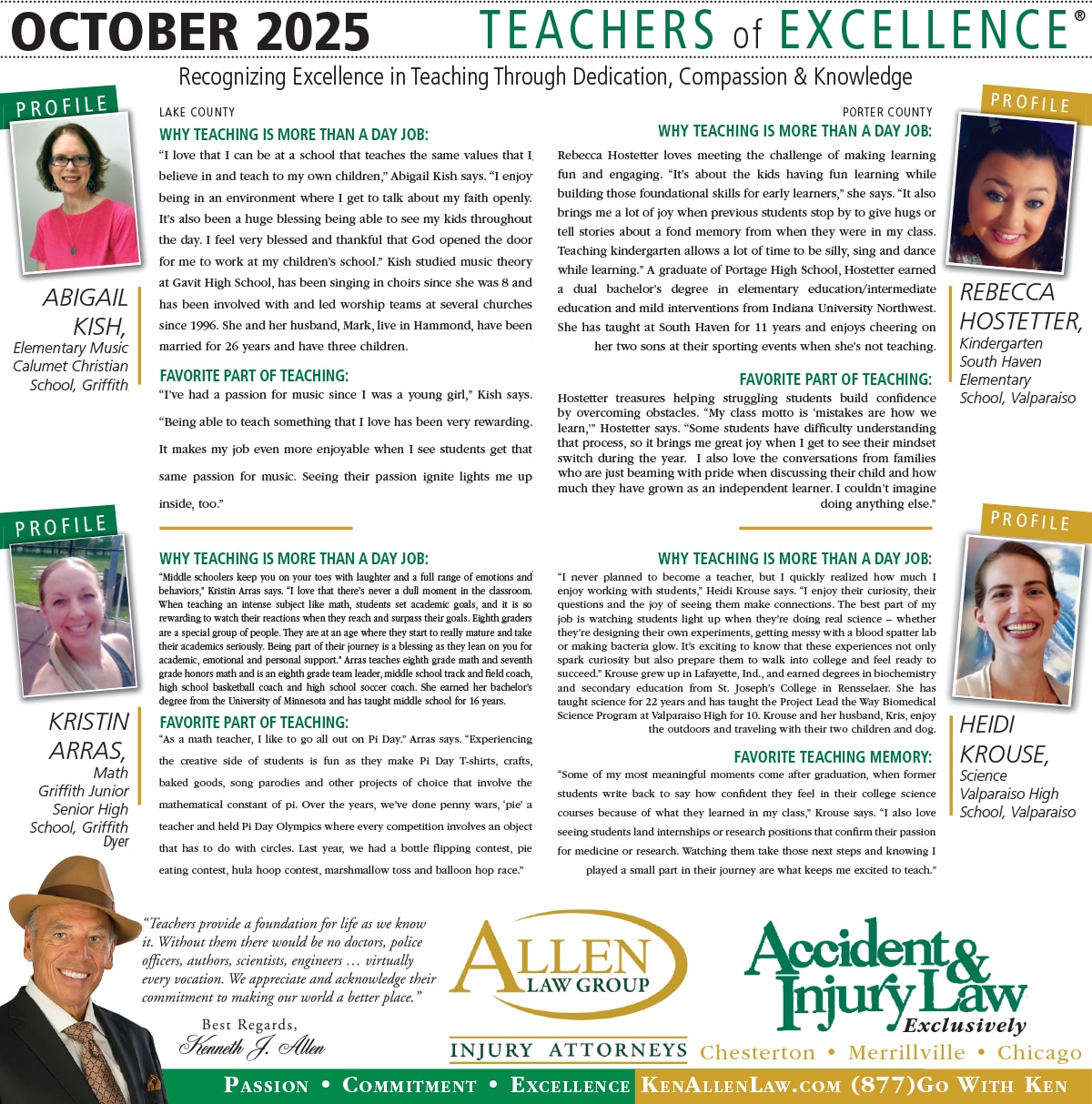 Allen Law Group is proud to support Northwest Indiana teachers who go above and beyond for their students. Allen Law Group recognizes Teachers of Excellence for his or her outstanding contributions to education. “Teachers provide a foundation for life as we know it. Without them, there would be no doctors, police officers, authors, scientists, engineers, virtually every vocation. We appreciate and acknowledge their commitment to making our world a better place,” said Mr. Kenneth J. Allen. Each teacher is recognized by the firm and receives a gift for their fine efforts. To learn more about the educators who are Teachers of Excellence, please read below. If you know of someone who should be recognized as a Teacher of Excellence, please nominate him or her on the page below. Allen Law Group is proud to support the area’s Teachers of Excellence.