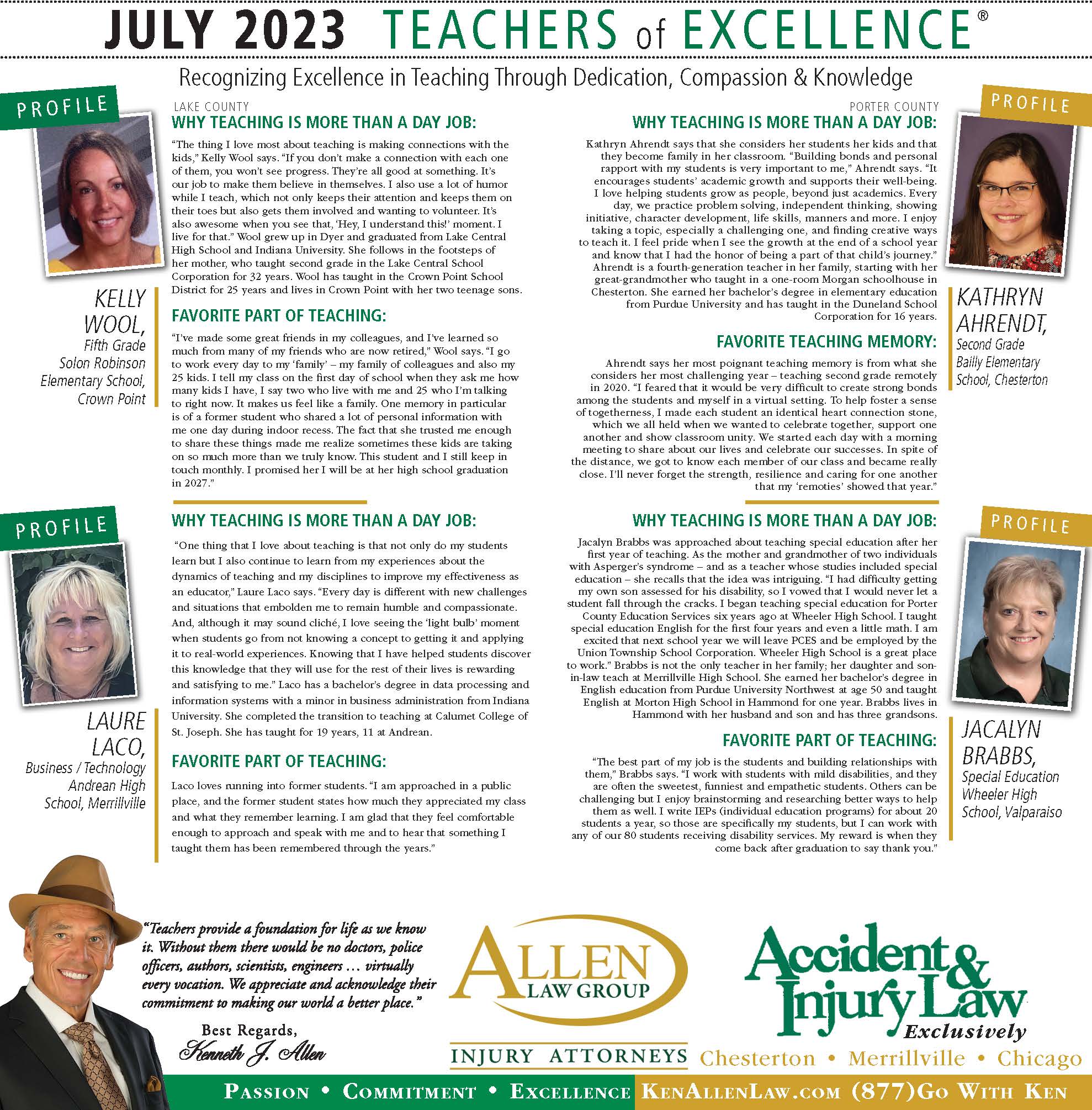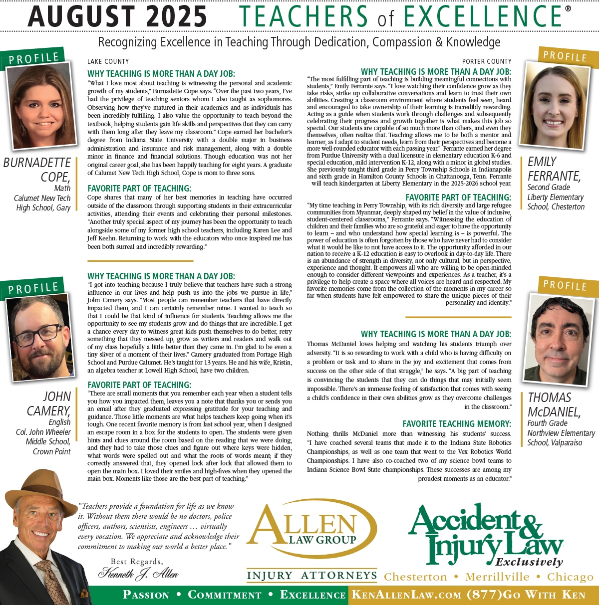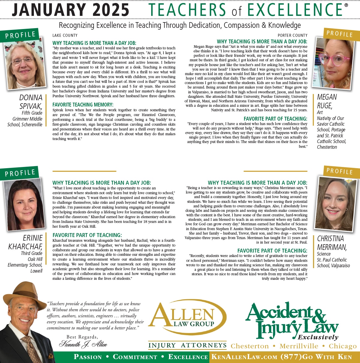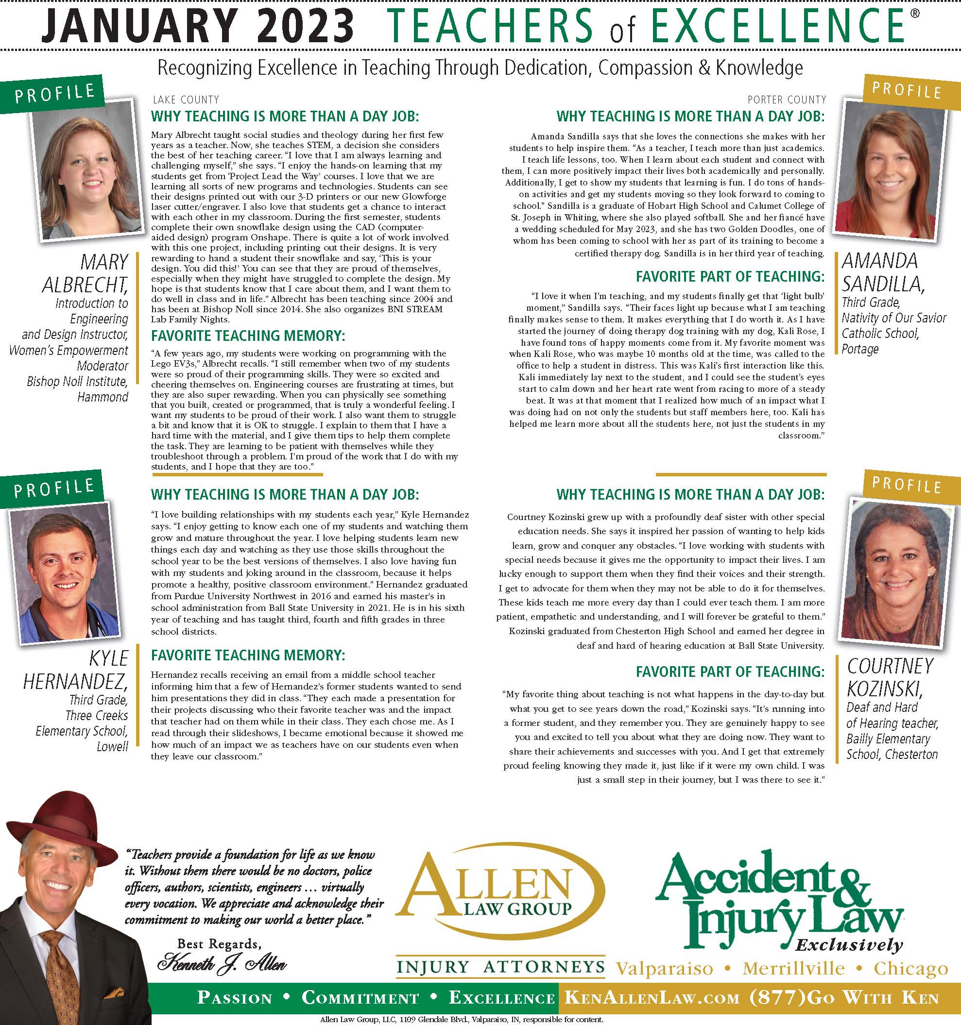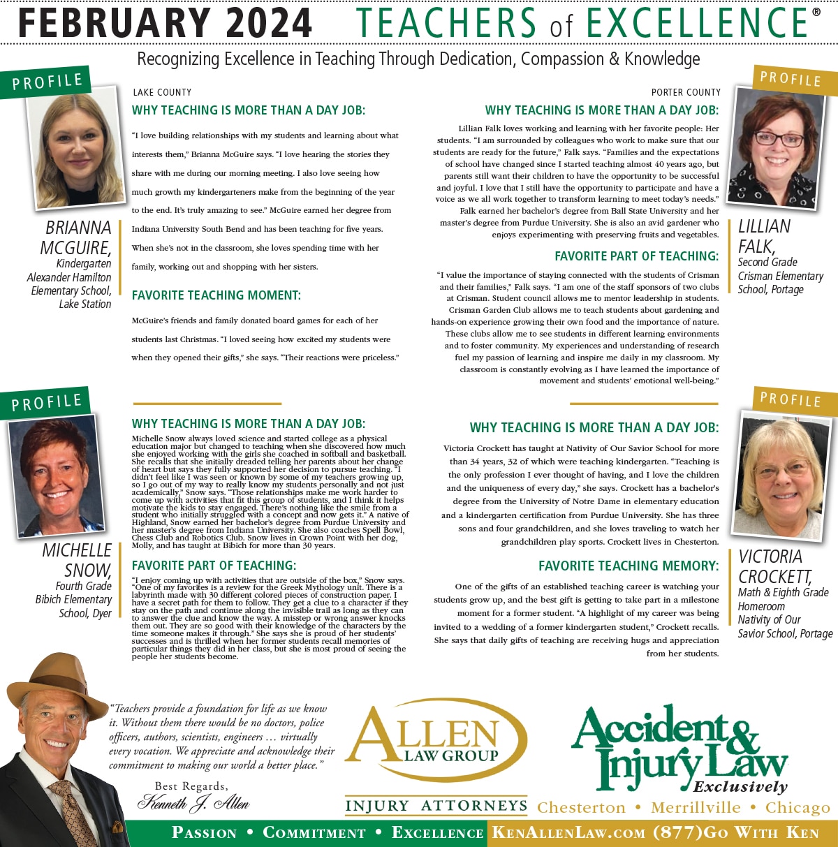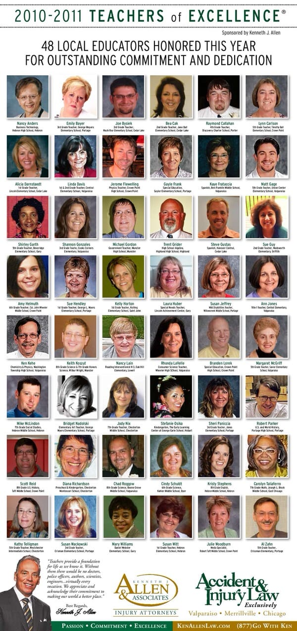 Allen Law Group is proud to support Northwest Indiana teachers who go above and beyond for their students. Allen Law Group recognizes Teachers of Excellence for his or her outstanding contributions to education. “Teachers provide a foundation for life as we know it. Without them, there would be no doctors, police officers, authors, scientists, engineers, virtually every vocation. We appreciate and acknowledge their commitment to making our world a better place,” said Mr. Kenneth J. Allen. Each teacher is recognized by the firm and receives a gift for their fine efforts. To learn more about the educators who are Teachers of Excellence, please read below. If you know of someone who should be recognized as a Teacher of Excellence, please nominate him or her on the page below. Allen Law Group is proud to support the area’s Teachers of Excellence.