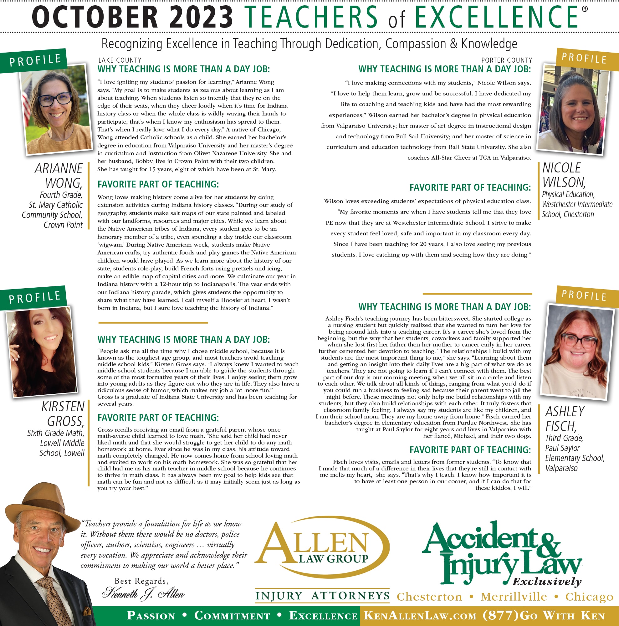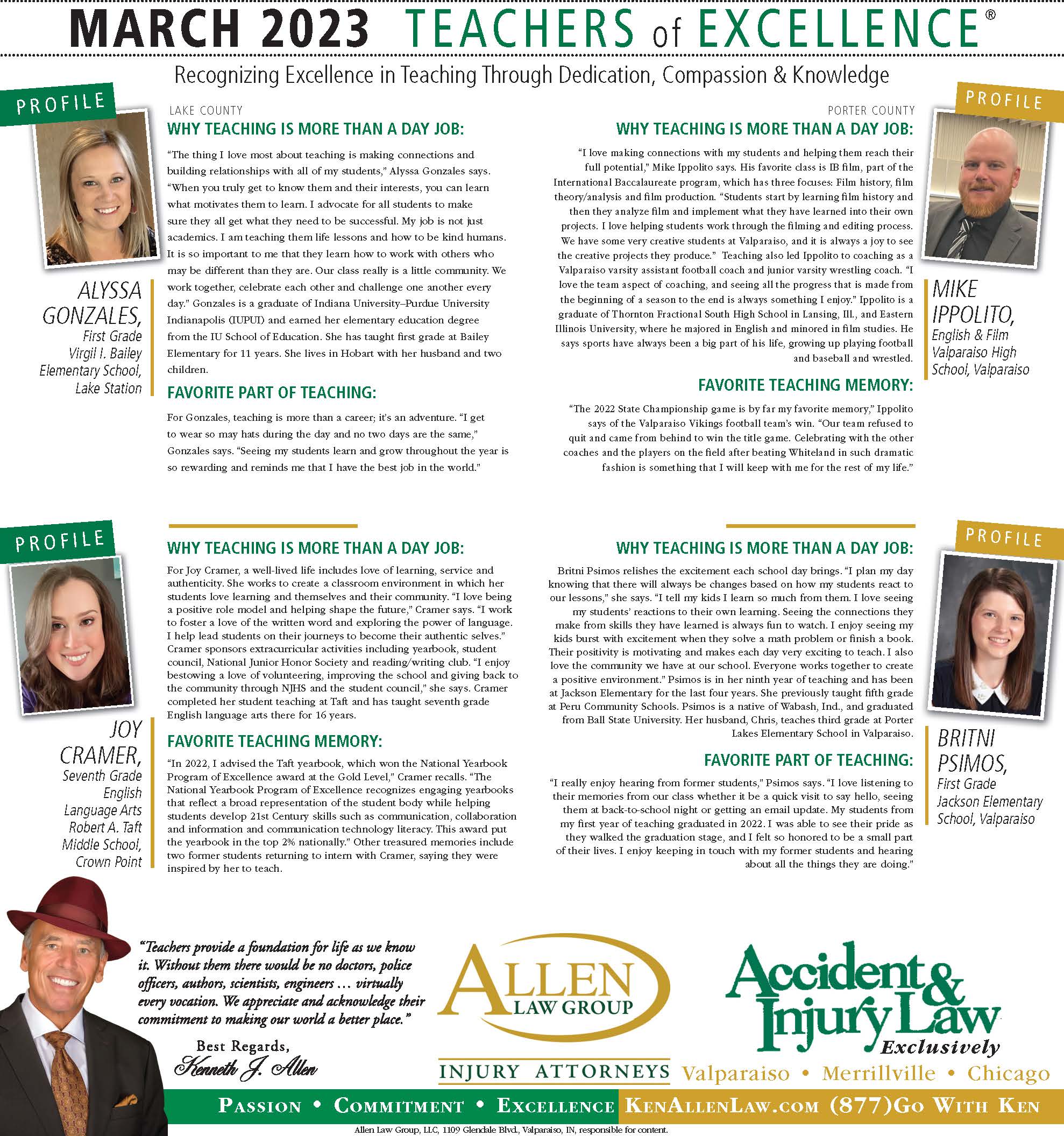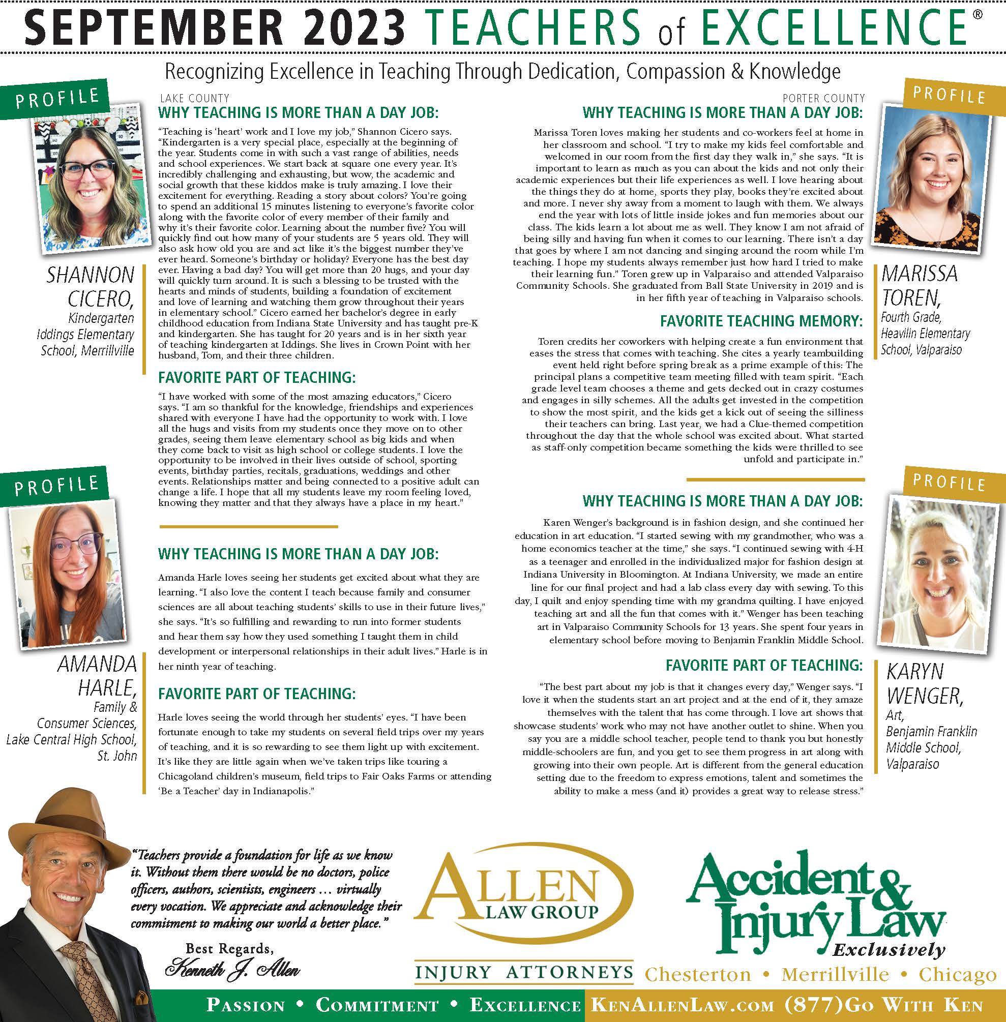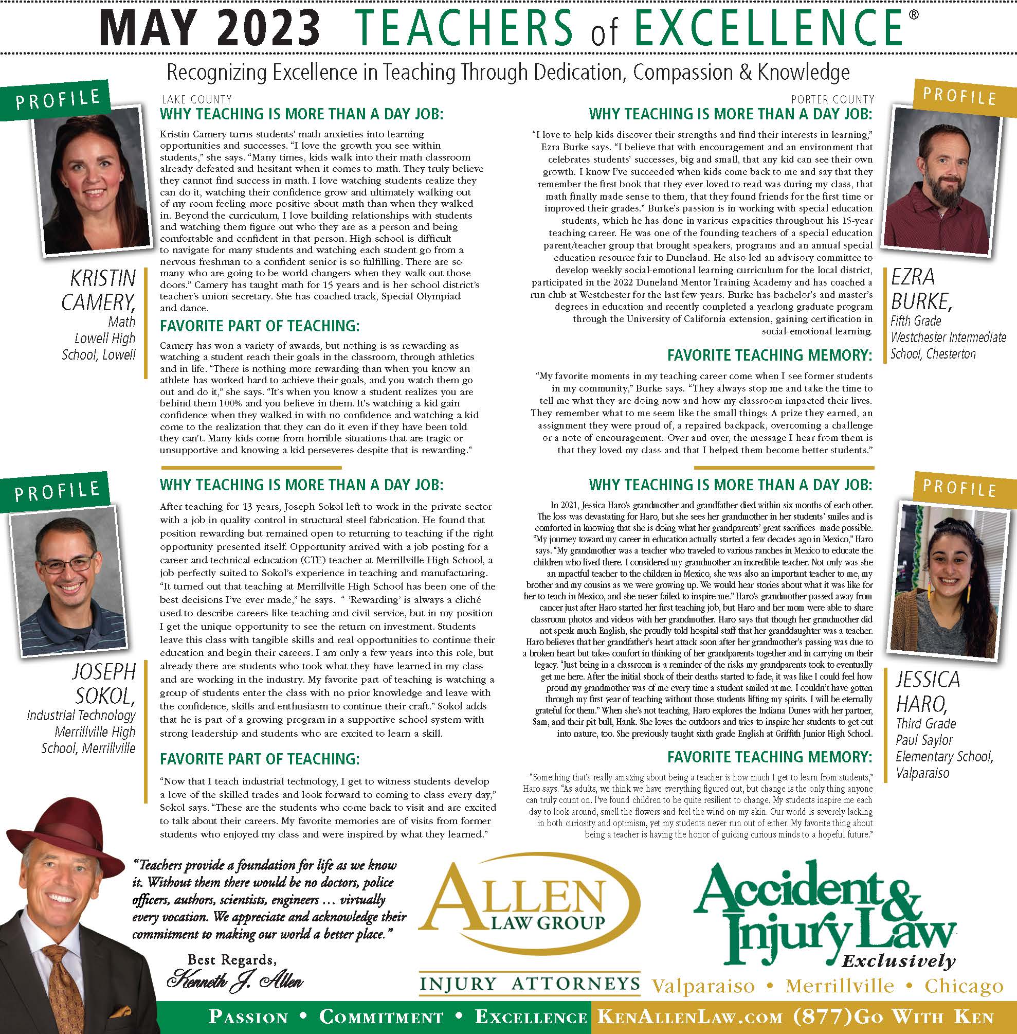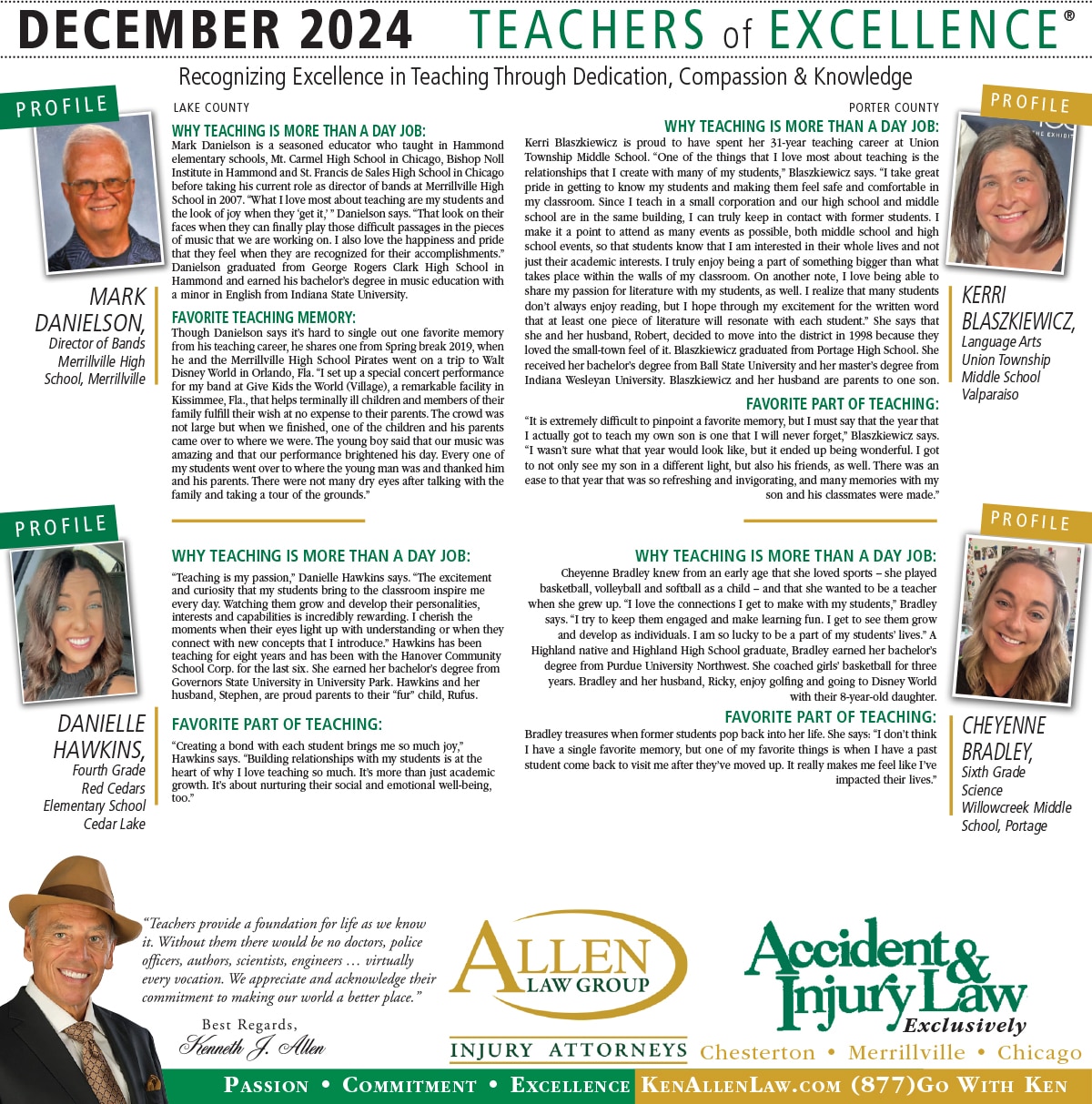 Allen Law Group is proud to support Northwest Indiana teachers who go above and beyond for their students. Allen Law Group recognizes Teachers of Excellence for his or her outstanding contributions to education. “Teachers provide a foundation for life as we know it. Without them, there would be no doctors, police officers, authors, scientists, engineers, virtually every vocation. We appreciate and acknowledge their commitment to making our world a better place,” said Mr. Kenneth J. Allen. Each teacher is recognized by the firm and receives a gift for their fine efforts. To learn more about the educators who are Teachers of Excellence, please read below. If you know of someone who should be recognized as a Teacher of Excellence, please nominate him or her on the page below. Allen Law Group is proud to support the area’s Teachers of Excellence.