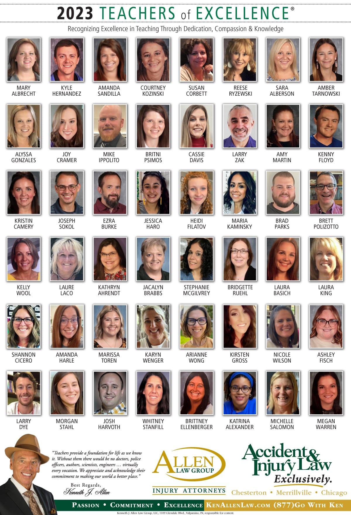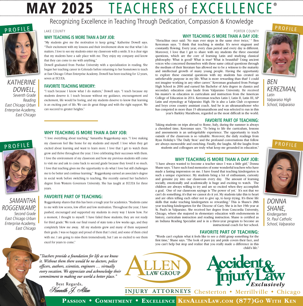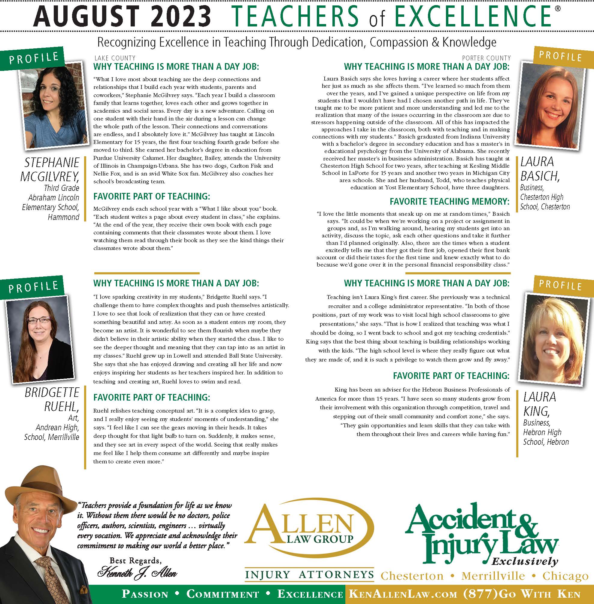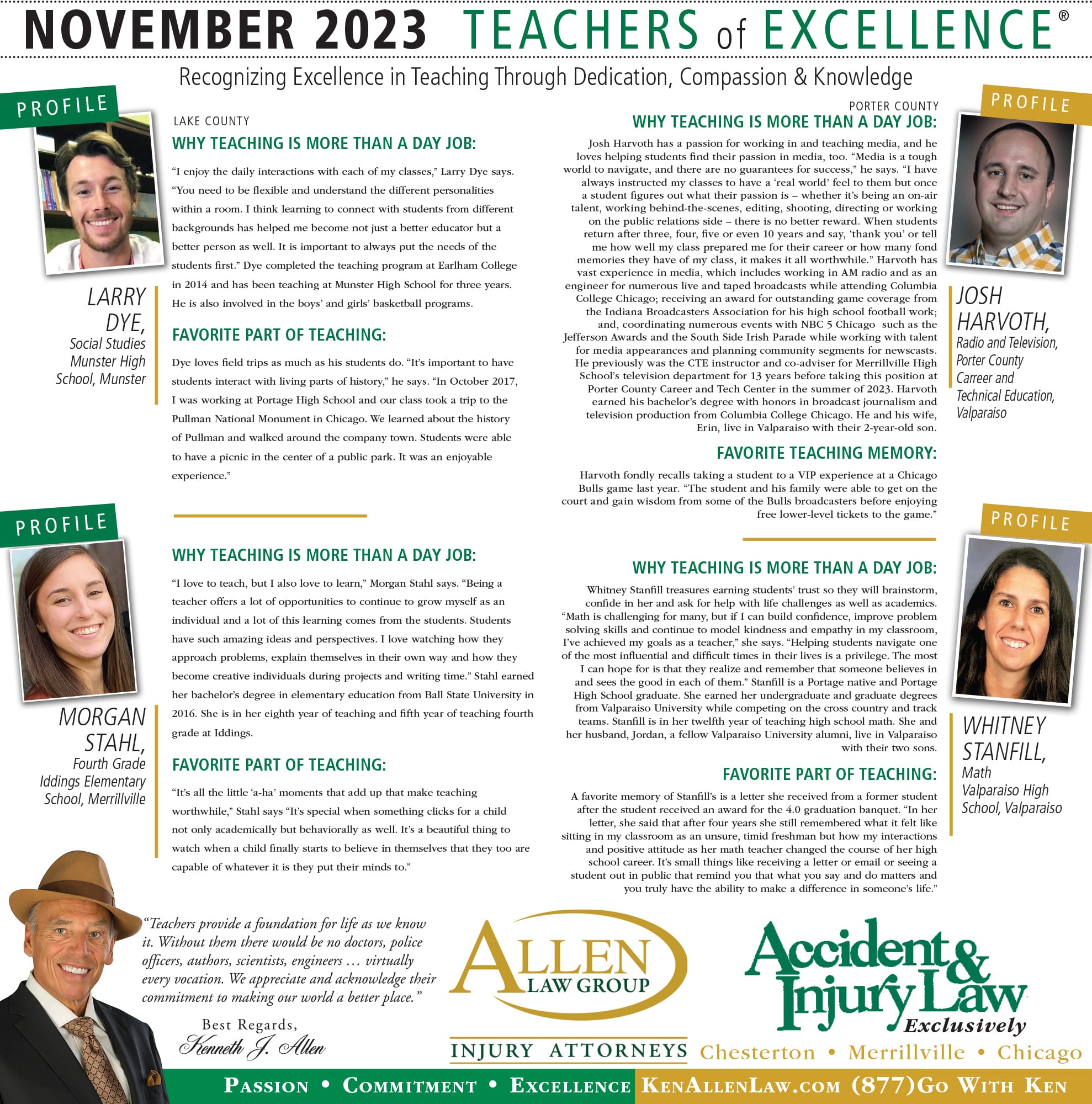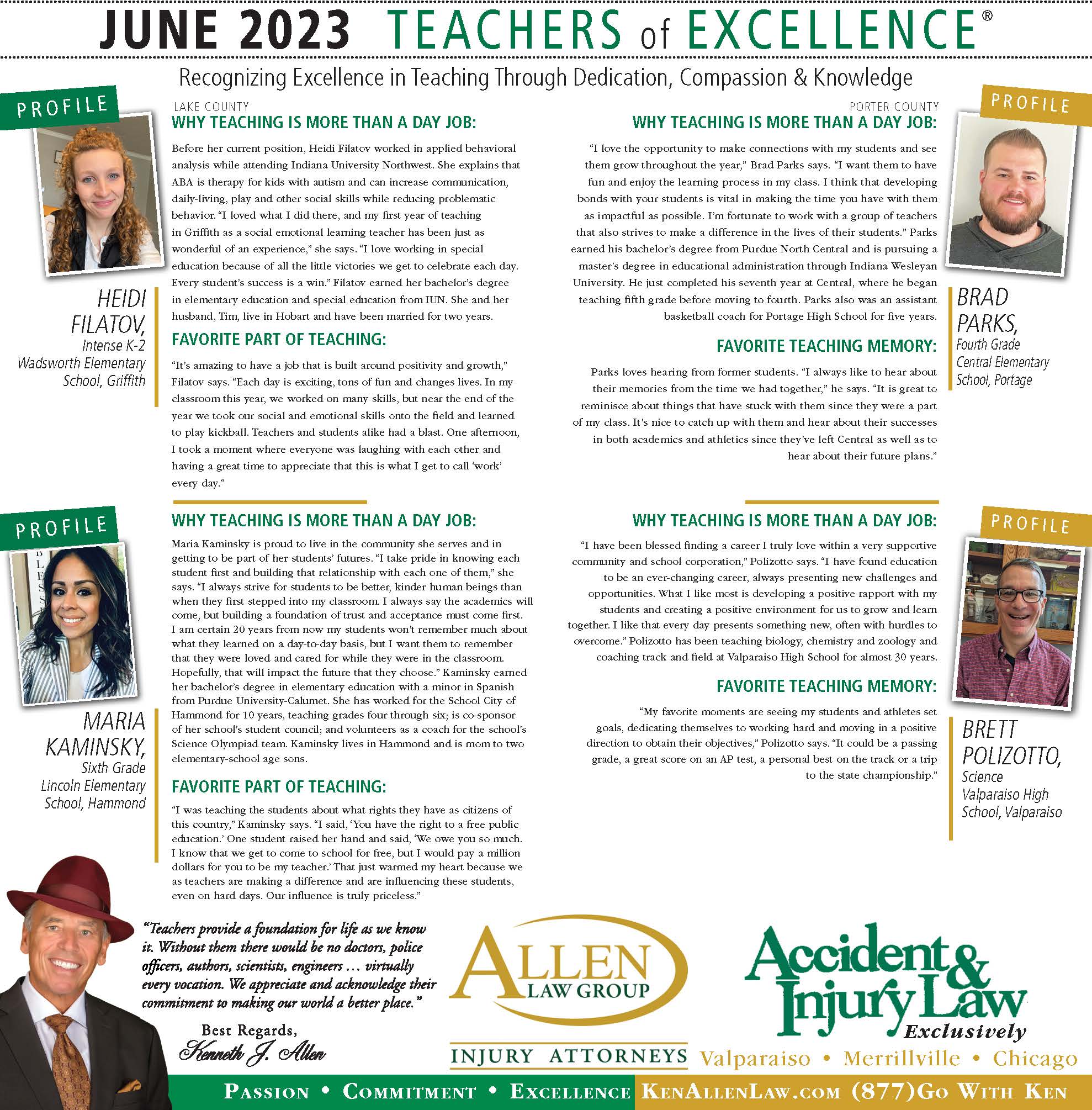 Allen Law Group is proud to support Northwest Indiana teachers who go above and beyond for their students. Allen Law Group recognizes Teachers of Excellence for his or her outstanding contributions to education. “Teachers provide a foundation for life as we know it. Without them, there would be no doctors, police officers, authors, scientists, engineers, virtually every vocation. We appreciate and acknowledge their commitment to making our world a better place,” said Mr. Kenneth J. Allen. Each teacher is recognized by the firm and receives a gift for their fine efforts. To learn more about the educators who are Teachers of Excellence, please read below. If you know of someone who should be recognized as a Teacher of Excellence, please nominate him or her on the page below. Allen Law Group is proud to support the area’s Teachers of Excellence.