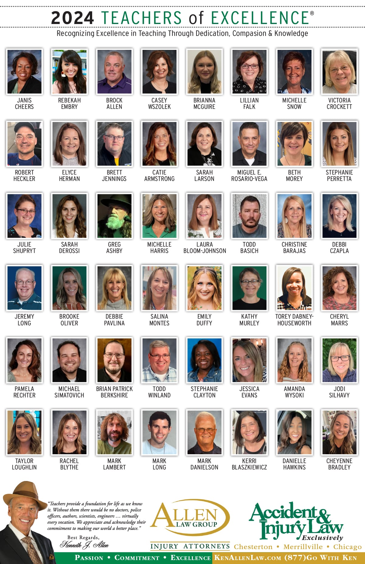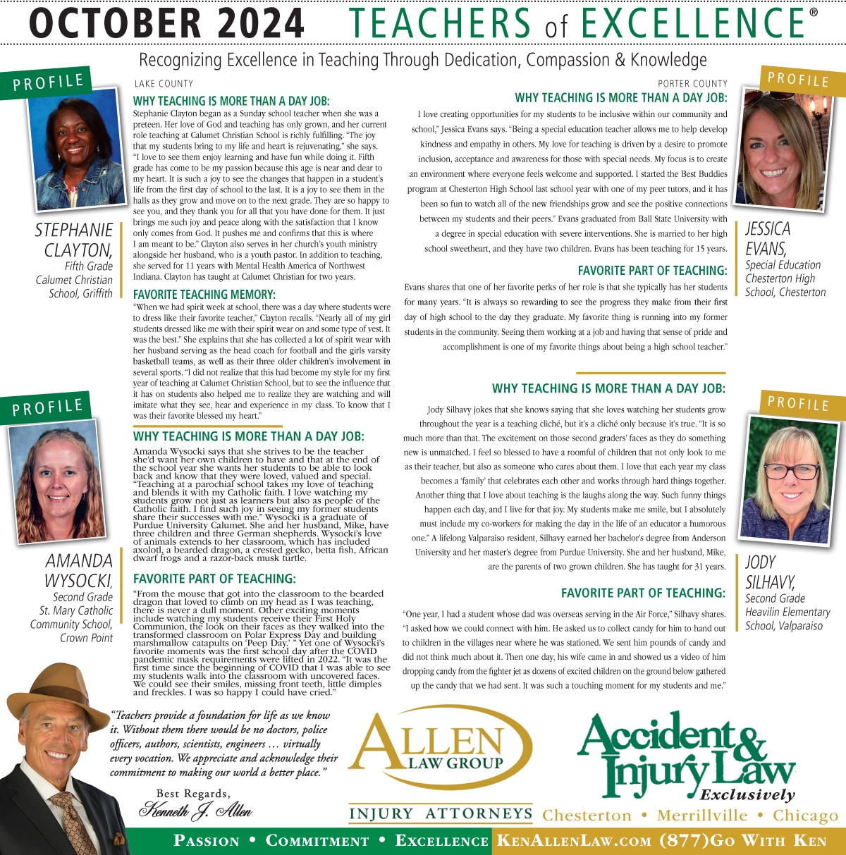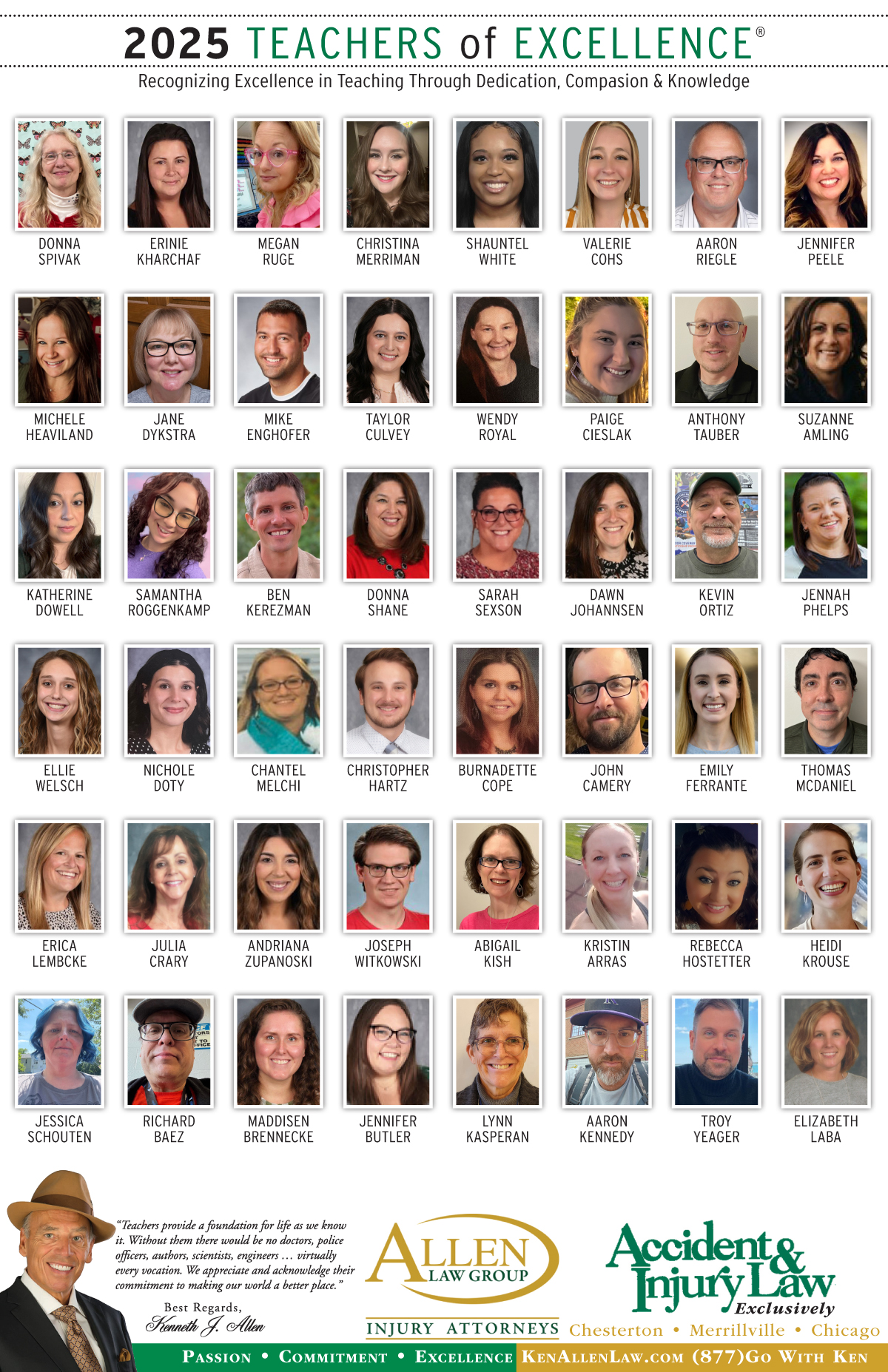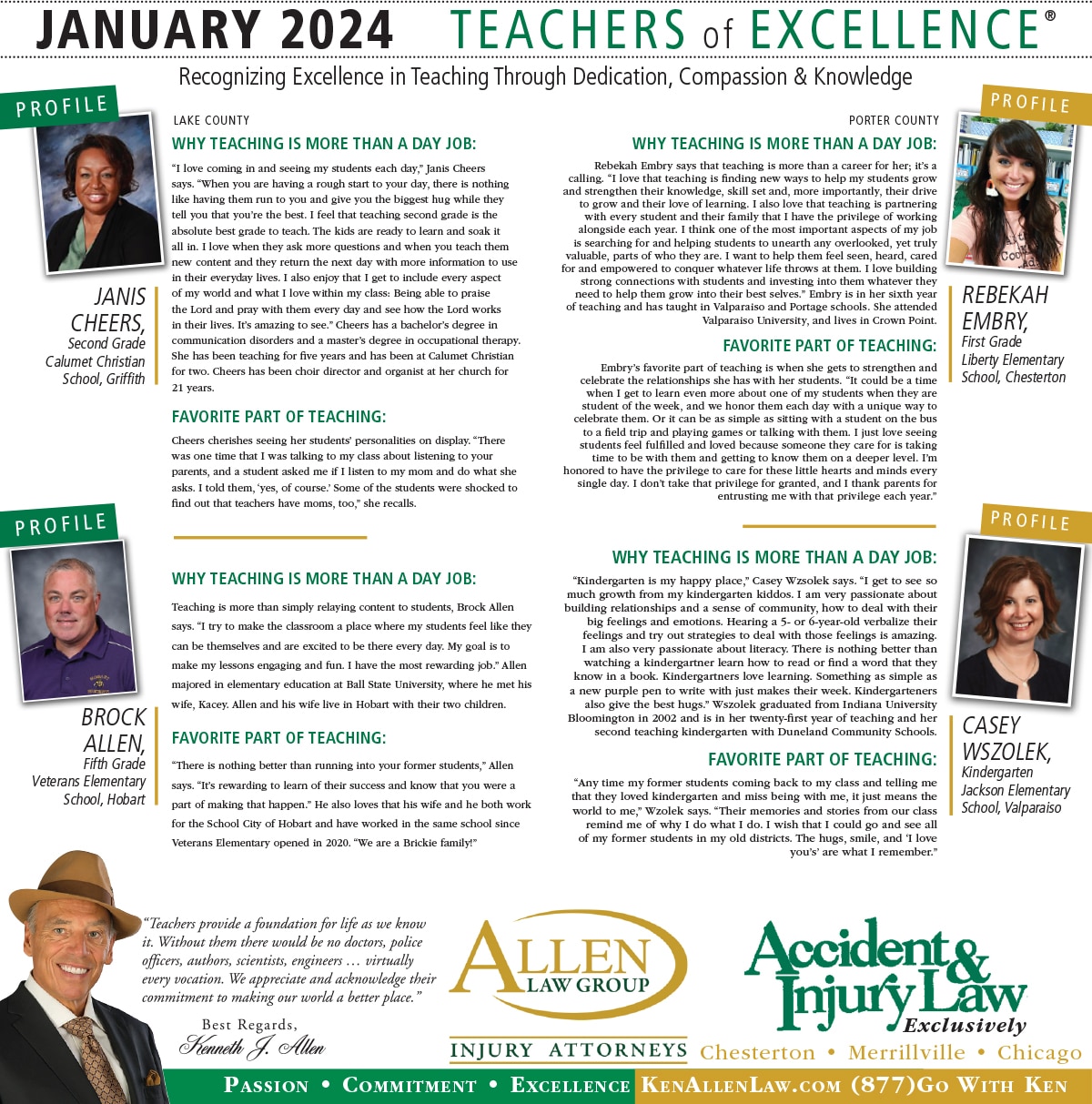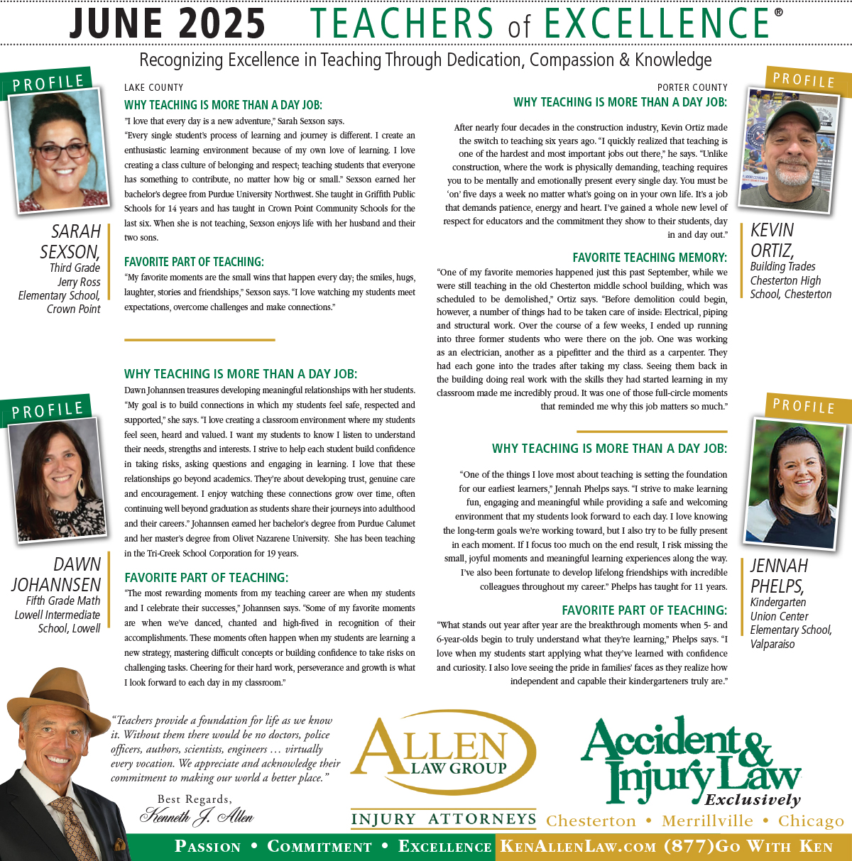 Allen Law Group is proud to support Northwest Indiana teachers who go above and beyond for their students. Allen Law Group recognizes Teachers of Excellence for his or her outstanding contributions to education. “Teachers provide a foundation for life as we know it. Without them, there would be no doctors, police officers, authors, scientists, engineers, virtually every vocation. We appreciate and acknowledge their commitment to making our world a better place,” said Mr. Kenneth J. Allen. Each teacher is recognized by the firm and receives a gift for their fine efforts. To learn more about the educators who are Teachers of Excellence, please read below. If you know of someone who should be recognized as a Teacher of Excellence, please nominate him or her on the page below. Allen Law Group is proud to support the area’s Teachers of Excellence.