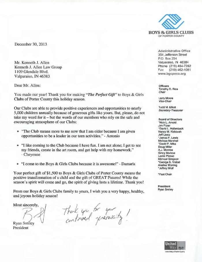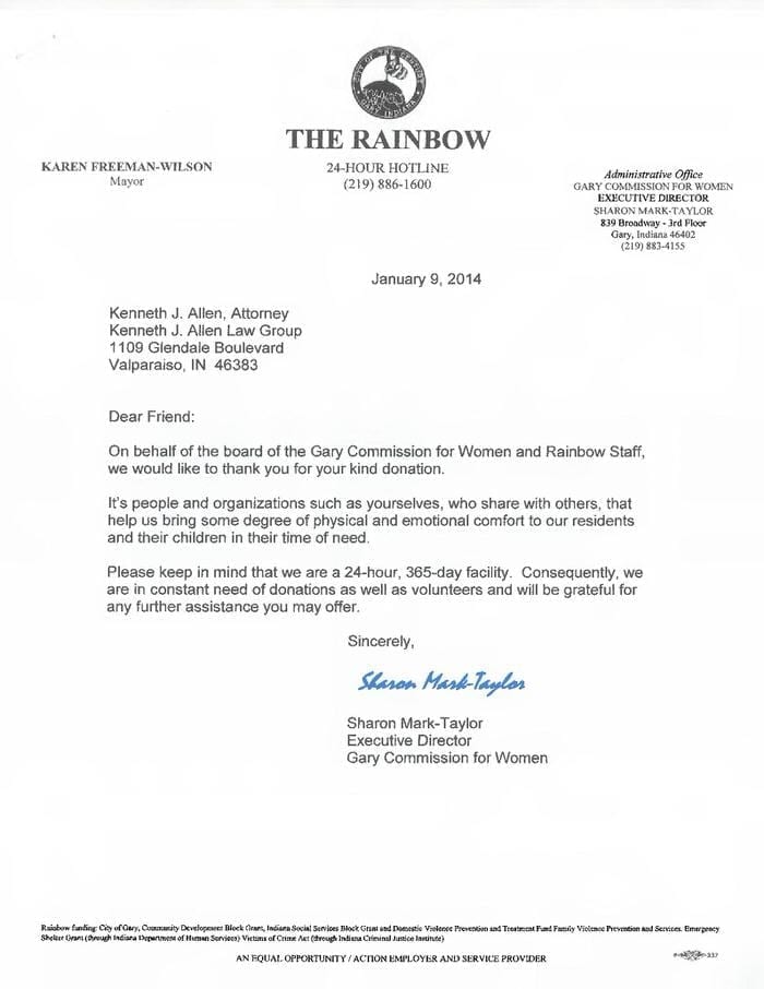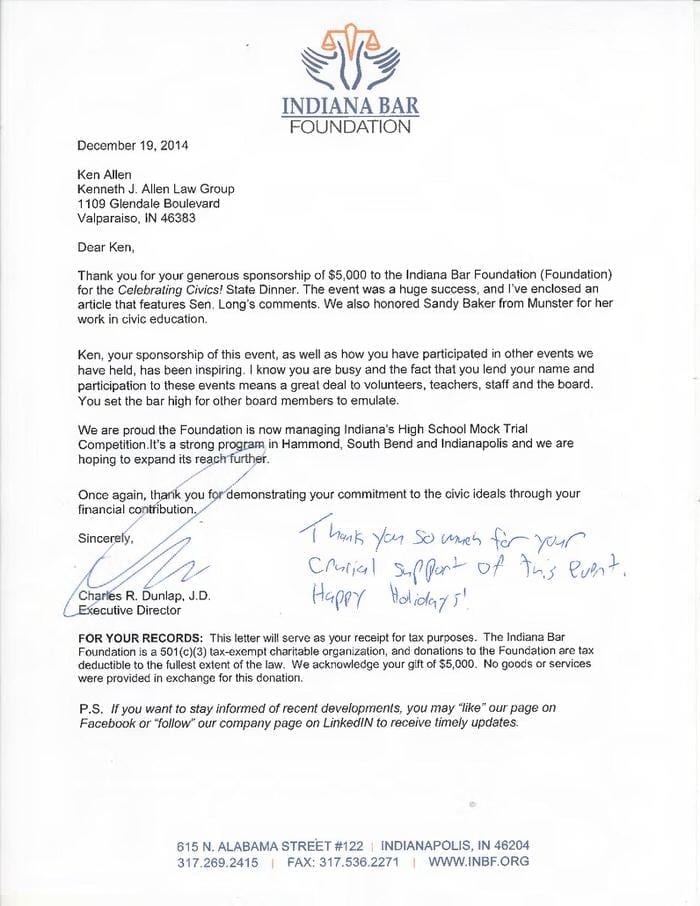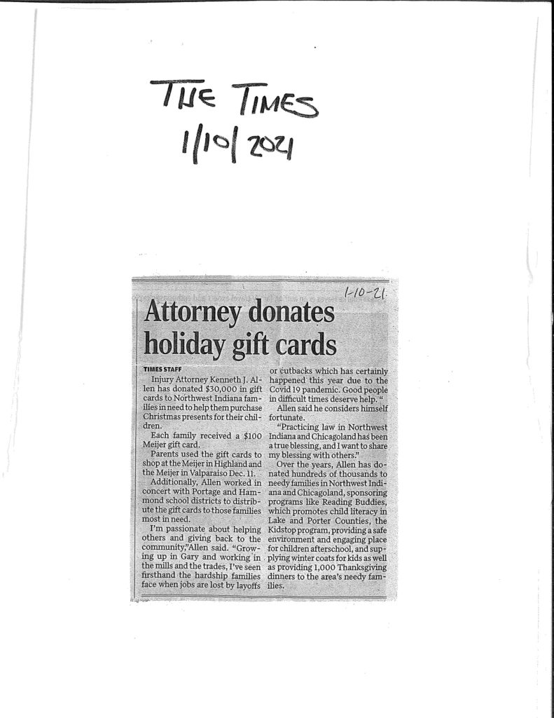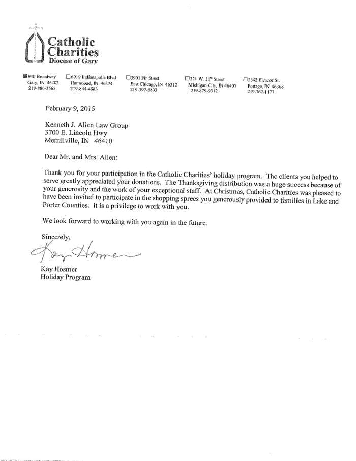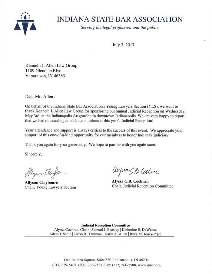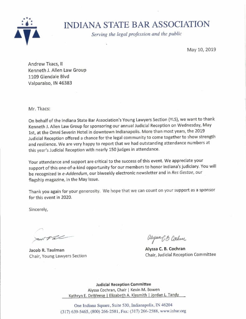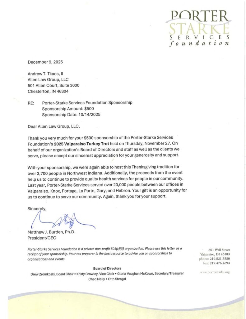 Allen Law Group considers it an honor to be able to contribute both as a firm, and individually as attorneys and support staff within the firm, to the community in Indiana and Illinois. The firm’s commitment to the area we serve is shown by its involvement in a variety of pro bono, civic, and philanthropic endeavors.