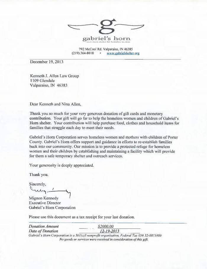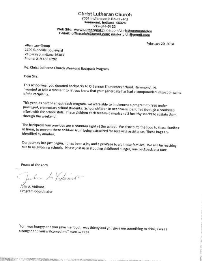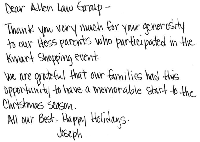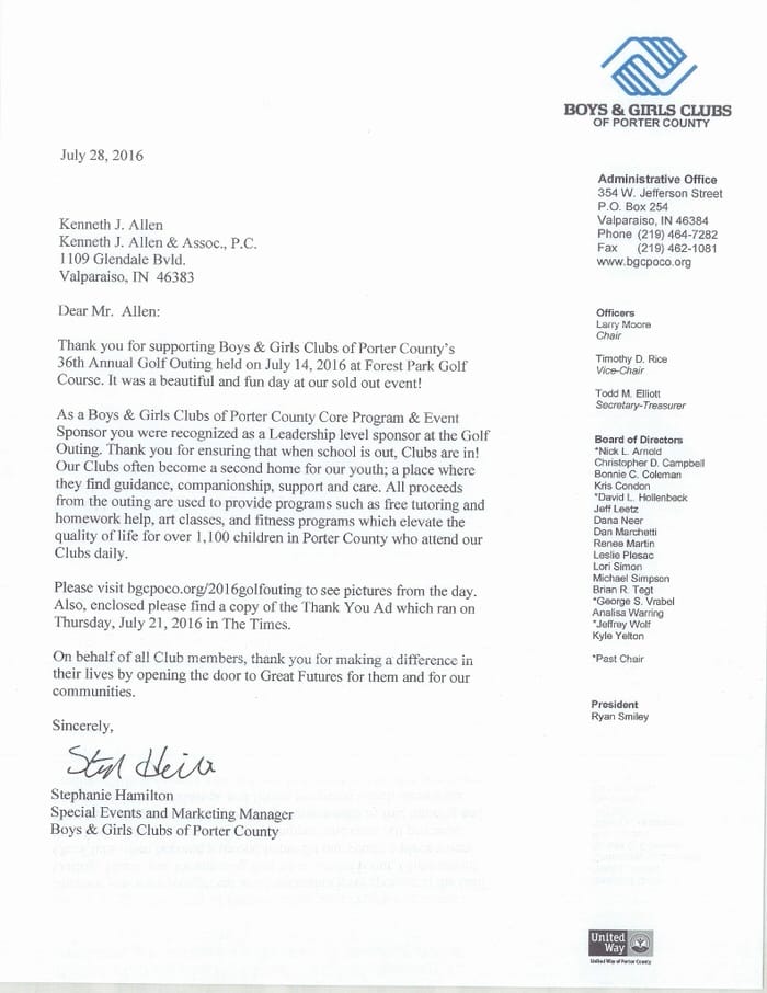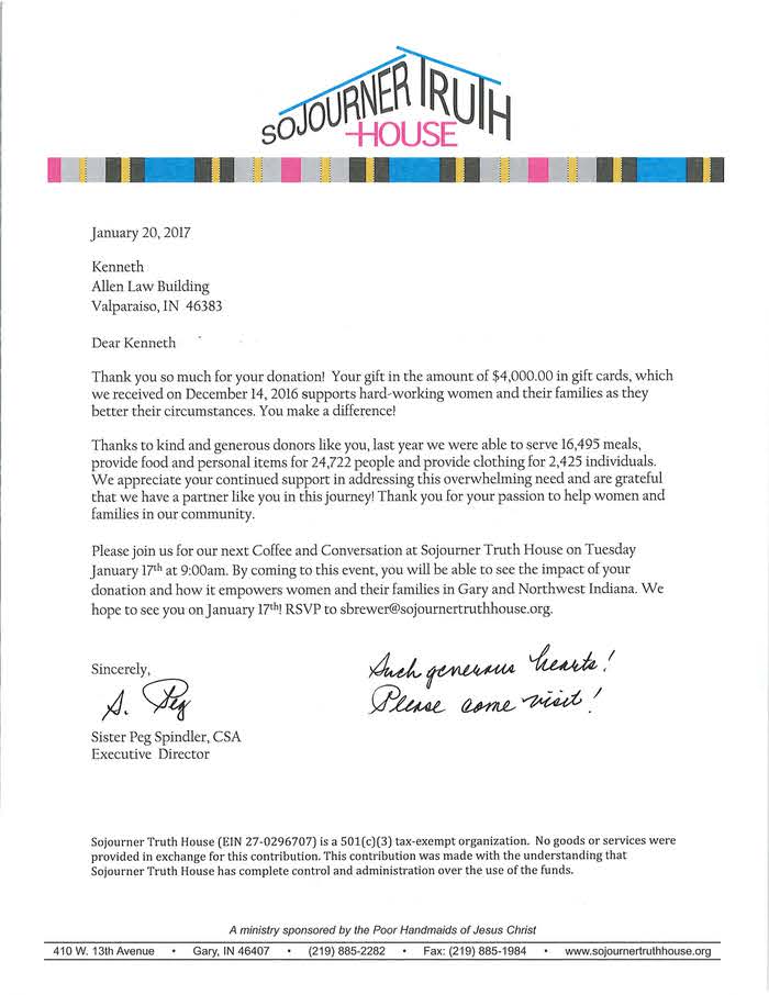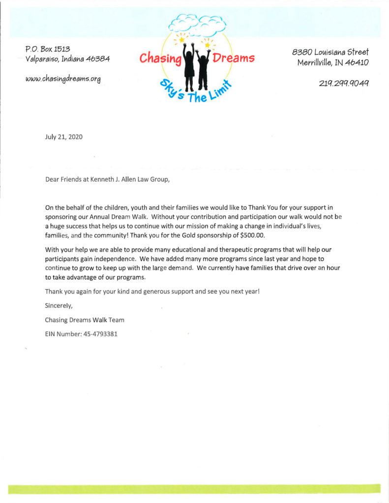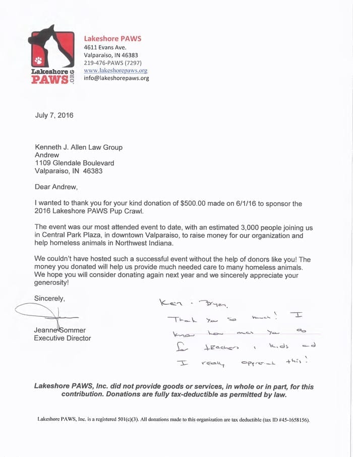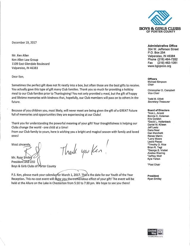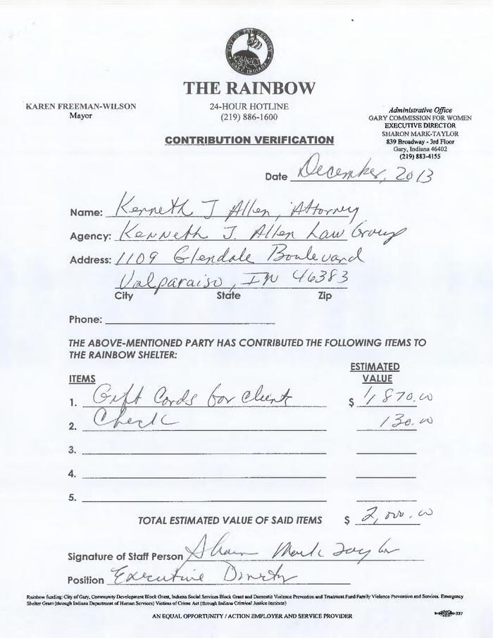 Allen Law Group considers it an honor to be able to contribute both as a firm, and individually as attorneys and support staff within the firm, to the community in Indiana and Illinois. The firm’s commitment to the area we serve is shown by its involvement in a variety of pro bono, civic, and philanthropic endeavors.